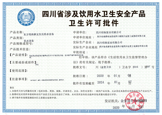 四川省涉及饮用水卫生安全产品卫生许可批件