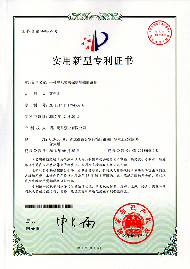 《一种电机喷漆保护转轴的设备》实用新型专利证书