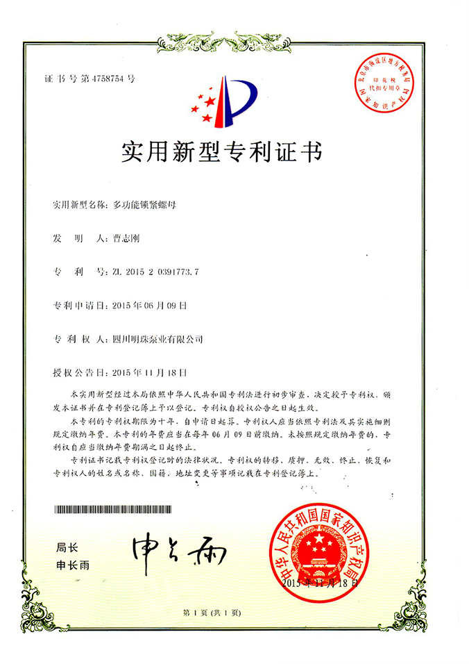 《一种采用玻璃钢与不锈钢合成的进出水管口》实用新型专利证书